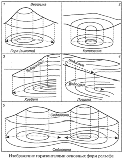 Рис. 1 Изображение горизонталями основных форм рельефа (по Вяткину Л.А с соавторами, 2001)