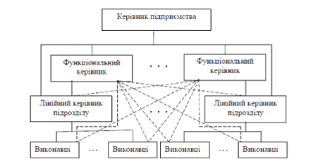 Лінійно-функціональна організаційна структура є одночасно розвитком і комбінацією двох попередніх структур управління. Вона забезпечує такий розподіл праці, при якому керівники лінійних ланок ухвалюють рішення і управляють, а функціональні керівники – консультують, інформують, планують і координують діяльність підприємства. В основу організації функціональних ланок покладено лінійний принцип. Керівник функціонального відділу є одночасно лінійним керівником підлеглих йому працівників. У загальному вигляді лінійно-функціональна структура управління показана на рисунку. Використання лінійно-функціональної структури або окремих її елементів характерно для крупних туристських підприємств.