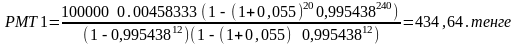 PMT = 100000 тенге . 0.00458333 : (1- 0.995438240) = 687,89 тенге.