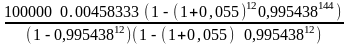 i = 5,5 % : 12 = 0,00458333, v = 1 : (1 + i) = 0.995438, N = 12.12=144,