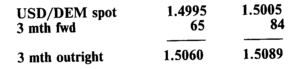Банк ААА запрашивает другой банк прокотировать ему 3-месячный своп USD/DEM на 1 млн. долларов и получает такое же значение форвардных пунктов (поскольку в течение короткого промежутка времени процентные ставки по двум валютам не успели измениться, поэтому остались без изменения форвардные пункты на период 3 месяца): 65 — 84.