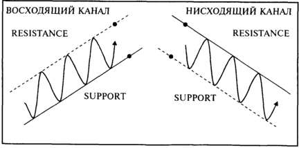 Колебания возрастающего валютного курса составляют восходящий канал (uptrend channel), понижающийся курс образует нисходящий канал (downtrend channel).