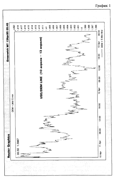 Значения курса, зафиксированные точками через определенные интервалы, соединяются прямой линией; в результате получается график движения курса. При этом горизонтальная ось служит для отражения времени (интервалов), на вертикальной оси откладываются значения валютного курса. На графике 1 приведен пример движения курса доллара к немецкой марке за двое суток на 11-13 апреля 1995 г. Обычно используется десять видов интервалов — «тик» (tick) то есть каждое новое значение курса, 1 мин., 2 мин., 5 мин., 10 мин., 1 час, 10 часов, сутки (24 часа), месяц, год.