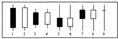 5 — yin с верхней тенью: курс повышался с начала дня, однако затем понизился и в конце дня был ниже значения на начало дня — признак снижения;