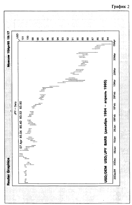 На графике 2 приведено движение курса доллара к японской иене за несколько месяцев (июль 1994 г.- апрель 1995 г.) с использованием дневных отрезков — баров.