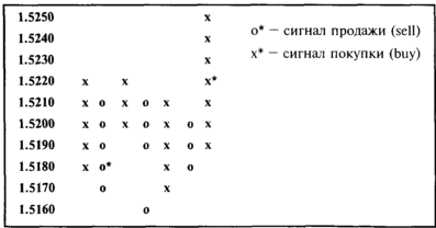 Колонка крестиков показывает повышение курса доллара, а колонка ноликов — его понижение. При этом, если в случае очередного движения курса вниз, он опустился ниже самого низкого значения (low) при предыдущем падении, то для дилера это является сигналом о продаже валюты (sell signal) в расчете на дальнейшее понижение курса. Если при очередном повышении курса он поднялся выше предыдущего наивысшего значения — это сигнал к покупке валюты (buy signal).
