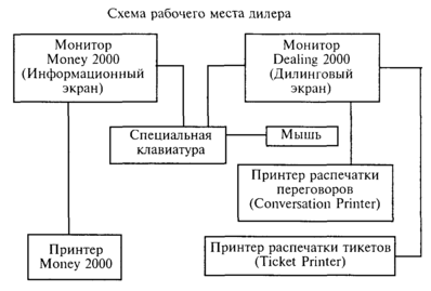 (Адрес представительства в СНГ — Россия, 121059, г. Москва, Бережковская наб. 2, г-ца «Редиссон-Славянская», Ленинградский пр-т д. 9, г-ца «Аэростар» тел. 241-01-11, 241-01-27). Информационное и дилинговое оборудование REUTERS-2000, на базе современных персональных компьютеров, объединенных в глобальную мировую сеть пользователей (подписчиков агентства), является сегодня самым надежным и широко распространенным средством слежения за рыночной конъюнктурой и заключения сделок. Рабочее место дилера состоит из 2 мониторов с общей клавиатурой, мышью и принтерами.