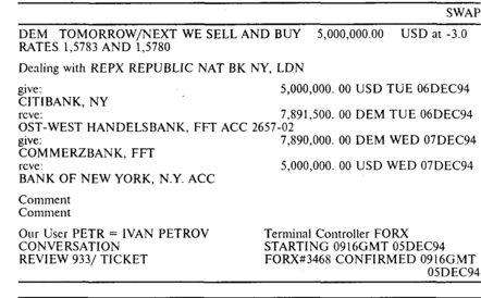 В отличие от обычной конверсионной сделки здесь используется два обменных курса для двух конверсии, из которых первый курс 1.5783 относится к более ближней дате валютирования — 06.12.94 г., а второй 1.5780 к форвардной то есть более удаленной дате — 07.12.94r.