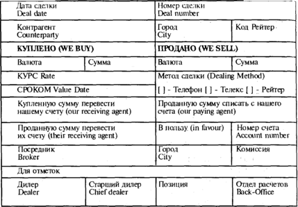 После заключения сделки дилер обязан составить документ, содержащий в стандартной форме все реквизиты сделки. Для сделок, заключенных на оборудовании Reuters Dealing 2000, система автоматически формирует «тикеты», которые можно подтвердить и распечатать вместе с текстом переговоров. Если сделка заключена по телефону, или если в банке не пользуются рейтеровскими «тикетами», дилер заполняет рапортички вручную, указывая все реквизиты сделки. Ниже приводятся образцы возможных рапортичек для конверсионной и депозитной сделок («конверсия» и «депозит» соответственно):