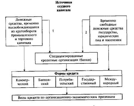 Рис. 17. Схема форм и видов кредита (заемщики: 1 – на расчетном счете, 2 – на депозитном)