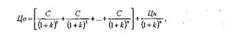 де С — річні ставка відсотку, що виплачується за облігацію (купонний платіж); Цн - номінальна ціна облігації; k - досконтна ставка (очікувана ставка доходу); п - число періодів.