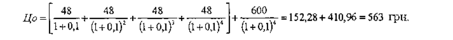 Наприклад. Обчислити ціну облігації підприємства, випущеної на термін 4 роки. Номінальна ціна облігації – 600 грн. Купонна ставка облігації – 8 %. Дисконтна ставка – 10 %. Відсотки за облігацію виплачуються щорічно.