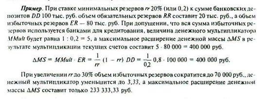 Повышение резервной нормы на несколько процентных пунктов снижает величину избыточных резервов и значение денежного мультипликатора, в результате чего возможности коммерческих банков создавать кредитные деньги уменьшаются.