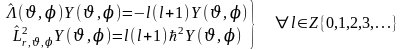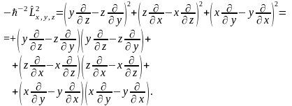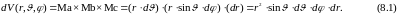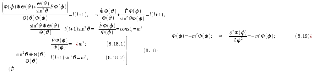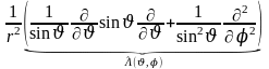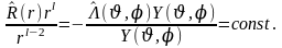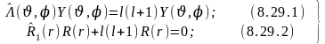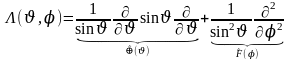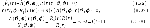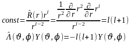 Интервалы изменения шаровых переменных: 0 Интервалы изменения переменных дают возможность выявить вид полярных диаграмм угловых функций - решений операторных уравнений. Элемент объёма в шаровых переменных (см. рис.): 8.3 Лапласиан. Важное свойство лапласиана состоит в его симметрия ко взаимным перестановкам декартовых координат. Из этого свойства вытекают и приёмы решения наиболее распространённых дифференциальных уравнений в частных производных с его участием. Простейшее дифференциальное уравнение в частных производных второго порядка, в котором лапласиан играет основную роль - уравнение Лапласа. В шаровых координатах лапласиан оказывается составленным из трёх независимых компонент-операторов, каждый из которых преобразует лишь одну из трёх независимых пространственных переменных. Симметрией конкретной системы предопределяется выбор координат, в которых следует выразить лапласиан, ею определяется вид решений дифференциальных уравнений, в которых уравнение Лапласа оказывается в роли однородной части. Таковы две задачи о сферически симметричных движениях. Первая из них о свободном вращении без потенциальной энергии. Вторая о вращении в поле центральной силы. Основная квантово-механическая модель, применяемая для исследования сферического вращения как с потенциальной энергией, так и без неё, называется РОТАТОР. Первая задача о стационарном вращении частиц с линейно распределённой массой относительно центра масс. Таковы все двухатомные молекулы, а также некоторые трёхатомные молекулы, такие как CO2, CS2. Эта задача более проста, и в ней вращение частицы свободное, т.е. совершается без потенциальной энергии (Urot=0), и единственный вклад в энергетические уровни даёт лишь кинетическая энергия вращения. В классической механике энергию такого движения можно было бы отождествить с энергией чисто тангенциального (касательного) перемещения частицы по сфере. Вторая задача о стационарном движении с потенциальной энергией в поле центральной силы. В классическом рассмотрении наряду с тангенциальной, чисто вращательной, появилась бы и радиальная компонента энергии. В атомах существенную роль играет лишь электростатическое взаимодействие, подчиняющееся закону Кулона. Силы гравитации по сравнению с ним неизмеримо мала. Для одного электрона в поле ядра с порядковым номером Z в Периодической Системе Менделеева потенциальная энергия притяжения в системе СГС равна U(r) = - Ze2/r. 8.4. Одноэлектронные атомы. Одноэлектронными сферически симметричными системами являются атом водорода, водородоподобные ионы (ионы, ядра которых имеют порядковые номера Z, в поле которых находится всего 1 электрон. Такие ионы образуются при Z-1 ступенчатой ионизации), а также атом позитрония, который образуется перед аннигиляцией электрон - позитронной пары в виде стационарной системы перед тем, как они аннигилируют, излучая два гамма-кванта. 8.5. Перевод лапласиана в шаровые координаты можно осуществить, следуя различным схемам. В сферических координатах лапласиан выглядит на первый взгляд довольно внушительно, но при ближайшем рассмотрении оказывается конструкцией, достаточно простой. Несложные, но довольно длительные преобразования приводят к следующему выражению: 8.6. Компоненты лапласиана. Для сокращения выделим в лапласиане два слагаемых - радиа