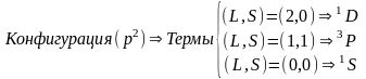 порождает 15 микросостояний электронной оболочки, которые группируются в три терма: