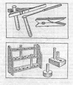 Специальный штатив для большинства опытов не требуется, но полезно сделать штатив-подставку для пробирок, чтобы не держать их долго в руках. Самый простой штатив – это брусок, в котором просверлены (не насквозь) отверстия диаметром чуть большим, чем диаметр пробирок.