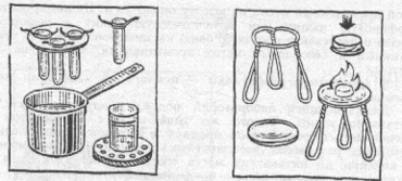 Водяную баню можно нагревать на газовой или электрической плите либо на закрытой электроплитке (пожалуйста, помните об аккуратности в работе!). Если же надо нагревать вещества на открытом пламени до более высоких температур, то лучше пользоваться горелкой с "сухим спиртом", таблетки которого продают в хозяйственных и спортивных магазинах, – таким сухим горючим часто пользуются туристы. Таблетки горючего дают ровное и жаркое пламя. Сжигать их надо на специально сделанном таганке. Его можно изготовить из толстой стальной проволоки в виде треноги и положить сверху жестяную крышку с загнутыми краями, например от стеклянной консервной банки; на этой крышке и поджигают таблетку. Приготовьте и жестяной колпачок, например маленькую консервную банку, которым вы будете гасить пламя: накройте колпачком горящую таблетку, воздух перестанет к ней поступать, и пламя погаснет.
