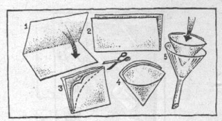 Чтобы сделать фильтр, надо приготовить квадратный кусок фильтровальной бумаги, сложить его пополам и еще раз пополам, а потом обрезать края так, чтобы при развертывании получился круг. Такой сложенный вчетверо листок надо раздвинуть, чтобы образовался конус. Половина этого конуса будет из одного слоя бумаги, другая половина – из трех слоев.