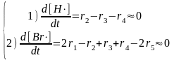 7) При выводе скорости r всего процесса используем два уравнения для квазистационарных концентраций свободных валентностей радикальных частиц атомов H• и Cl•: