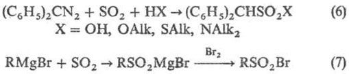 Диазоалканы сульфируют SO2 в присутствии воды, спиртов, тиолов и аминов (6), последоват. действие SO2 и галогена на реактивы Гриньяра приводит к сульфонил-галогенидам (7):