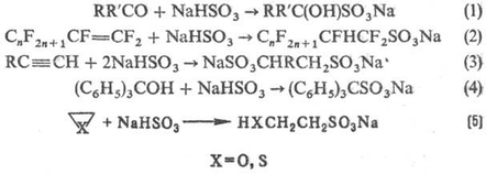 Для С. орг. соединений широко используют H2SO3 и ее производные. Гидросульфиты присоединяются к альдегидам и кетонам (р-ция 1), а также в условиях радикального инициирования к алкенам и алкинам (2,3); взаимод. с трифенил- и три (n‑толил) карбинолами (4); реагируют с оксиранами, тииранами с раскрытием кольца (5):