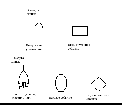 Для графического изображения простейшего дерева событий необходимо ввести базовый набор символических изображений, которые представлены на рисунке E.1. Данные типы вершин позволяют построить дерево отказов для огромного большинства систем. Однако, существуют ситуации, когда отказ наступает только при определенном порядке возникновения входных событий (отказов) или же в случае соблюдения некоторых временных условий (например: действие какого-нибудь фактора в течение определенного интервала времени), который больше допустимого, либо при некоторой комбинации этих требований. В этом случае построение и анализ деревьев отказов значительно усложняется.