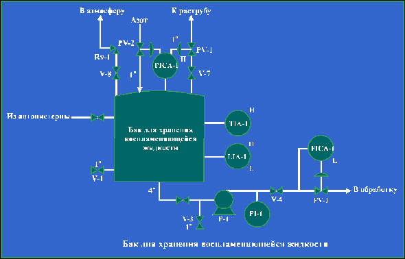 Система хранения воспламеняющейся жидкости в виде диаграммы распределения ресурсов и оборудования (P&ID Process and Instrumentation Diagrams) дана на рисунке G.1 – бак для хранения воспламеняющейся жидкости (Ozog, 1985) [4].