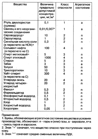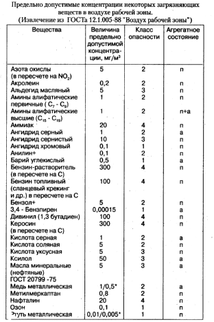 ПДК некоторых загрязняющих веществ в воздухе рабочей зоны