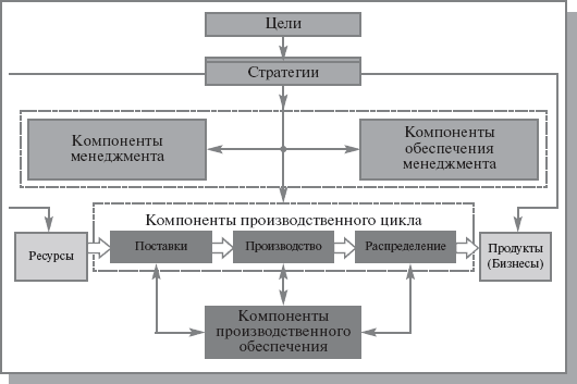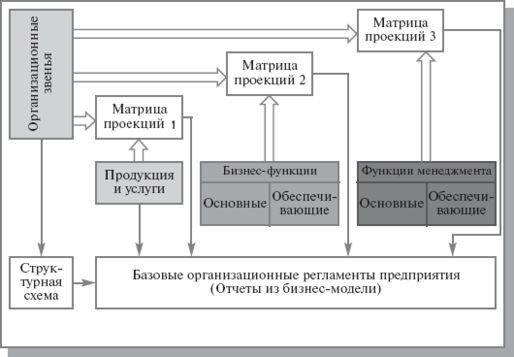 На основании миссии формируются цели и стратегии компании. С их помощью определяется необходимый набор продуктов и, как следствие - требуемые ресурсы. Воспроизводство продукции происходит за счет переработки ресурсов в основном производственном цикле. Его компоненты формируют необходимые бизнес-функции для поставки ресурсов, производства продуктов и их распределения в места реализации. Для управления указанным процессом воспроизводства формируется совокупность компонентов менеджмента, которая порождает набор функций управления. Для поддержания процессов воспроизводства и управления формируются наборы соответствующих функций обеспечения (охраны, технического оснащения, профилактики и ремонта и пр.). Такой подход позволяет описать предприятие с помощью универсального множества управленческих регистров (цели, стратегии, продукты, функции, организационные звенья и пр.). Управленческие регистры представляют собой иерархические классификаторы. Объединяя классификаторы в функциональные группы и закрепляя между собой элементы различных классификаторов с помощью матричных проекций, можно получить модель организационной структуры компании.