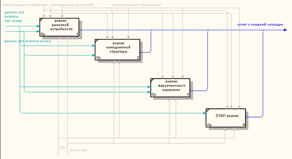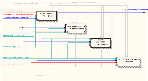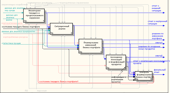| Мониторинг текущего и предполагаемого окружения | данные для анализа окружающей среды | Отчет о внешней ситуации (В результате формулируются исходные данные для ситуационного анализа и планирования изменений бизнес-портфеля). |