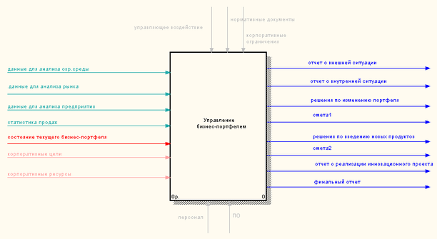 На рисунке 4.1 представлена контекстная диаграмма процесса «Управление бизнес-портфелем». Определена входная информация, которая некоторым образом изменяется работой и превращается в выходную информацию. При этом указаны стрелки механизма (работа осуществляется силами персонала и существующего программного обеспечения) и управления (выполнение работы подчинено управляющему воздействию, нормативным документам и осуществляется с учетом корпоративных ограничений).