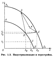 Обратимся к рис. 1.3. Общество первоначально находится в точке С на кривой AD. Чтобы выйти на более высокую кривую A1D1, оно должно создать новые производственные мощности. Но для этого сначала ему придется перейти из положения С в положение В, т.е. сократить производство предметов потребления, а значит и само потребление, с ХC до XB, направив высвобожденные ресурсы на увеличение выпуска средств производства с YС до YB. Лишь введя эти новые средства производства в эксплуатацию, общество сможет перейти на более высокую границу производственных возможностей A1D1 и выбрать на ней положение Е, при котором обеспечивается больший объем производства и средств производства, и предметов потребления по сравнению с точками и С, и В.