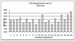 Результат работы программы имеет вид гистограммы, где около каждого столбца отображается номер интервала (кармана) и значение частоты.
