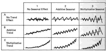 Наличие первых двух составляющих временного ряда можно приблизительно определить визуально, построив график временного ряда. На рисунке 1.3 показаны различные виды временных рядов с трендом и сезонной составляющей.