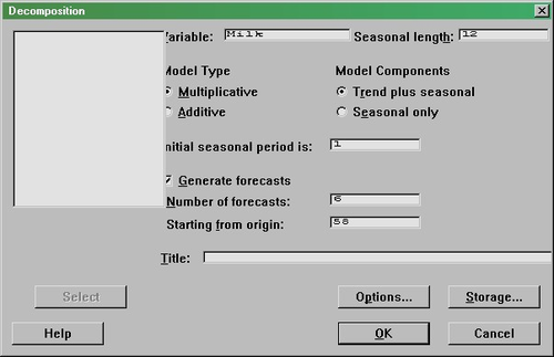 Для работы с этим видом анализа необходимо набрать: Stat > Time Series > Decomposition. В результате выполнения этой процедуры на мониторе появится следующие диалоговое окно (рисунок 1.4).