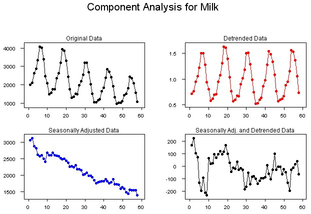 2. Временный ряд подвержен сильным сезонным колебаниям с максимумом производства в летние месяцы (апрель – сентябрь) и минимумом – в зимние (октябрь – март). При этом величина сезонных колебаний пропорциональна среднему уровню производства.