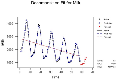 На рисунке 1.5 изображены исходные данные, оцененная линия тренда, оцененная линия тренда с сезонными колебаниями (predicted) и прогнозные значения.