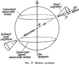 Не сразу было понято, что причиной строгой периодичности радиоимпульсов от этих новых источников (получивших название "пульсары") является быстрое вращение звездообразных объектов. Только вращение массивного тела может объяснить удивительное постоянство (с точностью до стомиллионной доли) периодов пульсаров. Более тщательные наблюдения показали, что на самом деле периоды не строго постоянны, а медленно растут. Представим себе, что излучение радиоволн не равномерно по всем направлениям, а сосредоточено внутри некоторого конуса, ось которого образует определенный угол с осью вращения. Теперь вообразим себе наблюдателя, который в какой-то момент времени находится на продолжении оси конуса. Ясно, что он сможет наблюдать радиоизлучение. Это будет возможно в течение некоторого времени до тех пор, пока из-за вращения звезды ось конуса уйдет, достаточно далеко. Однако через промежуток времени, равный периоду вращения звезды, радиоизлучение снова можно будет наблюдать. Эта простая модель пульсара изображена на рис.25.