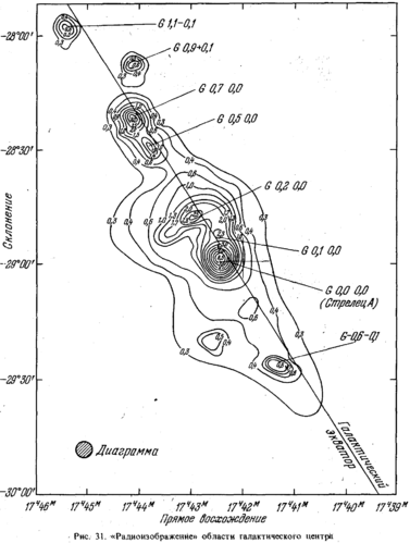 Вполне возможно и даже весьма вероятно, что много миллионов лет назад ядро нашей Галактики было "сейфертовским", т.е. активным. Так как Солнце и вся наша планетная система находятся очень близко от галактической плоскости, где много космической пыли, мы не можем методами оптической астрономии наблюдать ядро нашей Галактики. Однако в радио - и инфракрасном диапазоне это оказывается возможным. На рис.31 приведено "радиоизображение" области галактического центра. Компактный источник размерами в 10 секунд дуги в центре рис.31 и есть ядро нашей Галактики. Так как оно находится от нас на расстоянии около 30000 световых лет, его линейные размеры оказываются меньше одного парсека. Недавние радиоастрономические наблюдения показали, что в центре ядра имеется еще меньшее образование, размеры которого меньше нескольких тысячных парсека. По всем признакам в настоящее время ядро нашей Галактики "спокойно", хотя следы его довольно высокой активности в прошлом можно и сейчас наблюдать в виде газовых струй, поднимающихся над плоскостью Галактики на расстояние в несколько сотен парсек.
