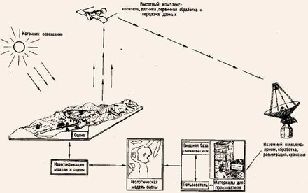 Сцена - это то, что находится перед датчиком; построение геологической модели сцены является в самом общем виде той целью, ради которой создается система. Изучение сцены на расстоянии возможно благодаря тому, что она обнаруживает себя в физических полях, которые могут быть измерены. Наиболее часто используются излученные или отраженные электромагнитные волны, в последнем случае необходим источник освещения, пассивный (например. Солнце) или активный (лазеры, радиолокаторы и др.). Физические поля измеряются датчиками, входящими в состав высотного комплекса, который кроме измерений служит для первичной обработки и передачи данных на Землю. Данные, закодированные в электромагнитном сигнале или записанные на твердотельные носители (фотопленки, магнитные ленты и пр.), доставляются в наземный комплекс, в котором происходит их прием, обработка, регистрация и хранение. После обработки данные обычно переписываются в кадровую форму и выдаются в качестве материалов дистанционного зондирования, которые по традиции называются космическими снимками. Пользователь, опираясь на внешнюю базу знаний, а также собственный опыт, интуицию, проводит анализ и интерпретацию материалов ДЗ и создает геологическую модель сцены, которая и является формой регистрации решения поставленной проблемы. Достоверность модели проверяется сопоставлением, или идентификацией модели и сцены; идентификация замыкает систему и делает ее пригодной для прикладного пользования.