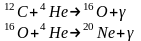 . Расчет показывает, что запасы гелия звезда истратит приблизительно за 10 млн. лет. Если ее масса достаточно большая, ядро продолжает сжиматься и при температуре свыше 500 млн. градусов становятся возможными реакции синтеза более сложных атомных ядер по схеме: