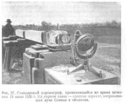За рис. можна отримати уявлення про коронографа, використовуваних радянськими астрономами - камерах для фотографування корони. Для того щоб отримати велике зображення Сонця і корони, об'єктив коронографа робиться довгофокусним. У його фокусі, де виходить зображення, ставиться фотографічна пластинка, яка знімає корону під час затемнення.