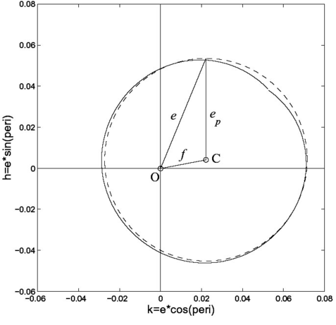 Усредненные результаты численного интегрирования элементов орбиты астероида можно представить как сумму “свободных колебаний” и “вынужденной” компоненты, обусловленной планетными возмущениями. На рис.1 показано сглаженное изменение эксцентриситета орбиты астероида e за 20000 лет, которое равно векторной сумме “вынужденного” эксцентриситета f и постоянного “собственного” эксцентриситета ep. Аналогично в осях q=sin(i)cos(Ω), p=sin(i)cos(Ω) определяется “собственное” наклонение орбиты sin(ip). А “усредненное” по времени значение большой полуоси принимается за “собственную” полуось ap.