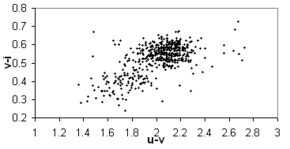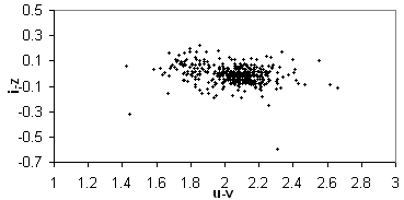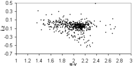 Мы видим, что новые астероиды (из каталога SDSS) присутствуют в зоне ограниченной эллипсоидом. Выше указанным методом отберем эти астероиды и рассмотрим их на цветовой диаграмме.