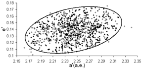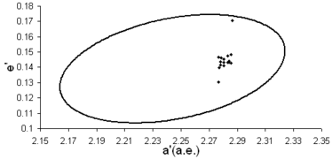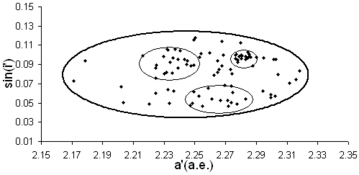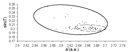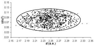 Рис.2.8 Астероиды из рисунка 2.7 удовлетворяющие условие a’(2,273:2,89) sin i’(0,091:0.103).