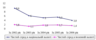 На рис. 2.4 видно, що чистий спред в національній валюті протягом 2002-2006 років досить відчутно знизився. Дане зниження може свідчити про зниження доходу банків від кредитних операцій в національній валюті, але в загальному якщо взяти до уваги стрімкий розвиток ринку кредитування та зростання попиту на кредити, то, необхідно сказати, що дохід банків тільки зріс. Зниження спреду відбулося у зв’язку зі зростанням економіки протягом досліджуваного періоду, зміцненням позиції гривні, а також зі значним підвищенням попиту на кредити і появою на ринку банківський послуг нових банківських установ.