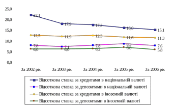 Рис. 2.3. Динаміка процентних ставок банків за кредитними і депозитними операціями за 2002-2006 роки