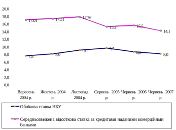 Рис. 2.1. Динаміка облікової ставки НБУ та відсоткової стави за кредити комерційних банків України за 2004-2007 роки.