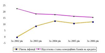 Рис. 2.2. Динаміка рівня інфляції та відсоткової ставки на кредити комерційних банків України за 2002-2006 роки.