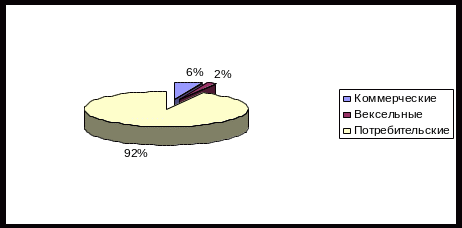 Основную долю – 86% – в кредитном портфеле занимают потребительские кредиты – наиболее доходные, но и рискованные вложения для РосБанка, вексельные кредиты – 8%, коммерческие кредиты – 6,4%.
